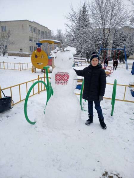 •  – Робити   сніговика –  весело й  цікаво, – каже Матвійко, який  разом із бабусею Надею  зліпив цього красеня у вишиванці. –  Ніколи не знаєш, який він у тебе вийде. Може бути  гарний, рівний, з милою посмішкою, а може — кривобокий, сумний. Ми відразу вирішили, що наш сніговик повинен вийти охайним і веселим, а  ще вдягнули його у вишиванку. Відра на голову не було, ми берет йому зробили.