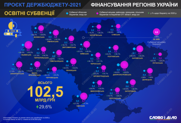 У проєкті держбюджету не передбачена медична субвенція місцевим бюджетам, вона скасована в рамках медичної реформи (її замінить інша програма). Субвенція на освіту закладена в розмірі 102,5 млрд грн. Зокрема, міський бюджет Києва отримає 5,5 млрд. У цілому, в порівнянні з цим роком фінансування освіту виросте у всіх регіонах в середньому на 20-30%.