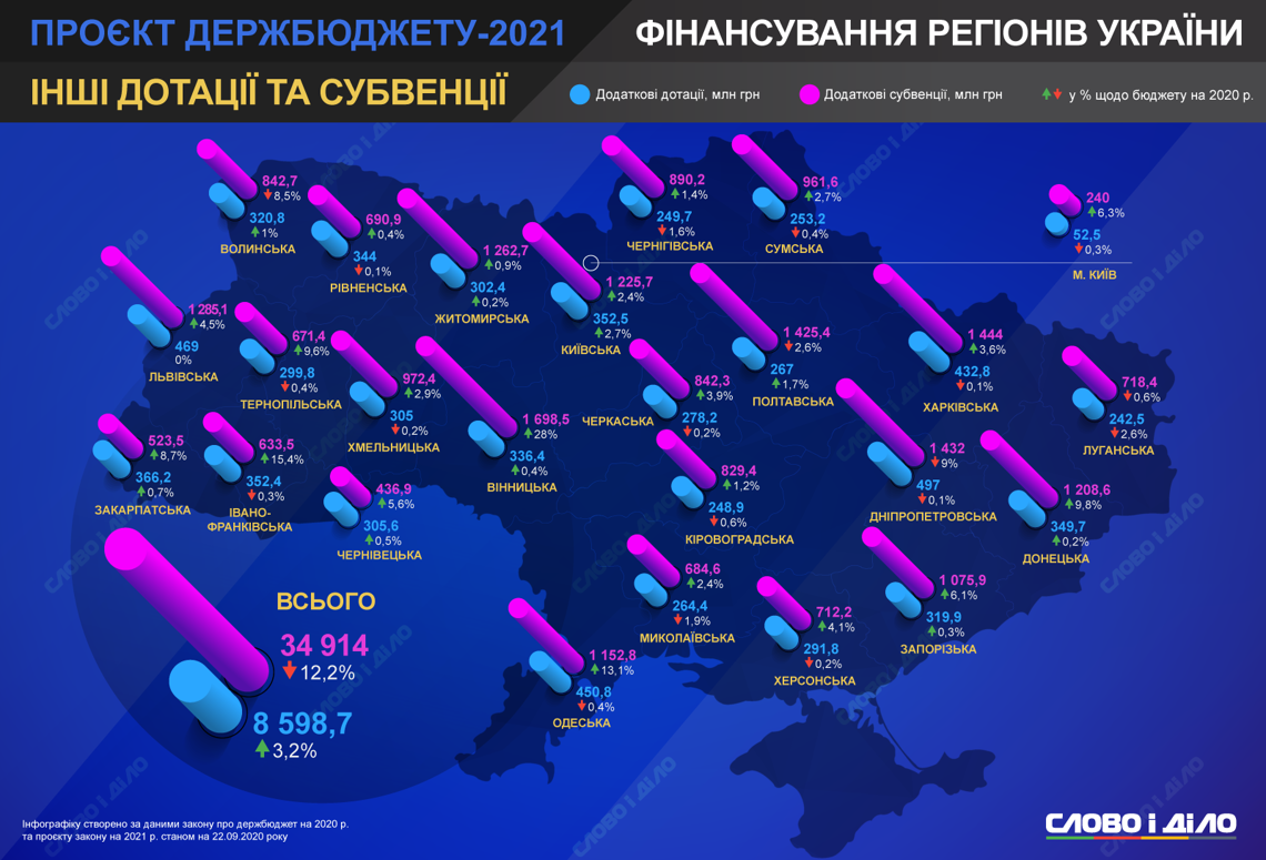 Крім того, в проєкті бюджету на 2021 рік передбачили 8 млрд 598,7 млн грн додаткових дотацій (+3,2% в порівнянні з поточним роком) і 34 млрд 914 млн грн додаткових субвенцій (-12,2%).