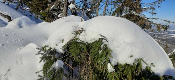 Відпочивши, ми почали рухатися  лісовими хащами. Мене чекали  виснажливі підйоми, щоб звучало яскравіше, скажу, диким  лісом, який обкидав  сніжками з верхівок дерев. Легше стало, коли почалися чорничники,  що вибивалися на стежку. Принаймні, вони не охолоджували тебе сніговою купіллю.