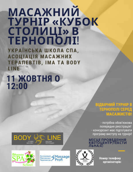 Масажний турнір «Кубок Столиці» відбудеться у Тернополі 11 жовтня. Даний відбірковий чемпіонат проходитиме для масажистів Тернополя і Тернопільщини. В рамках турніру будуть відібрані учасники фіналу чемпіонату України. Організатори Першого етапу відбіркового турніру в місті Тернополі “Українська школа СПА”, “Асоціація масажних терапевтів Massage Profi”, “Масажна школа “Body Line”. Другий етап (фінал) буде проходити у Києві.