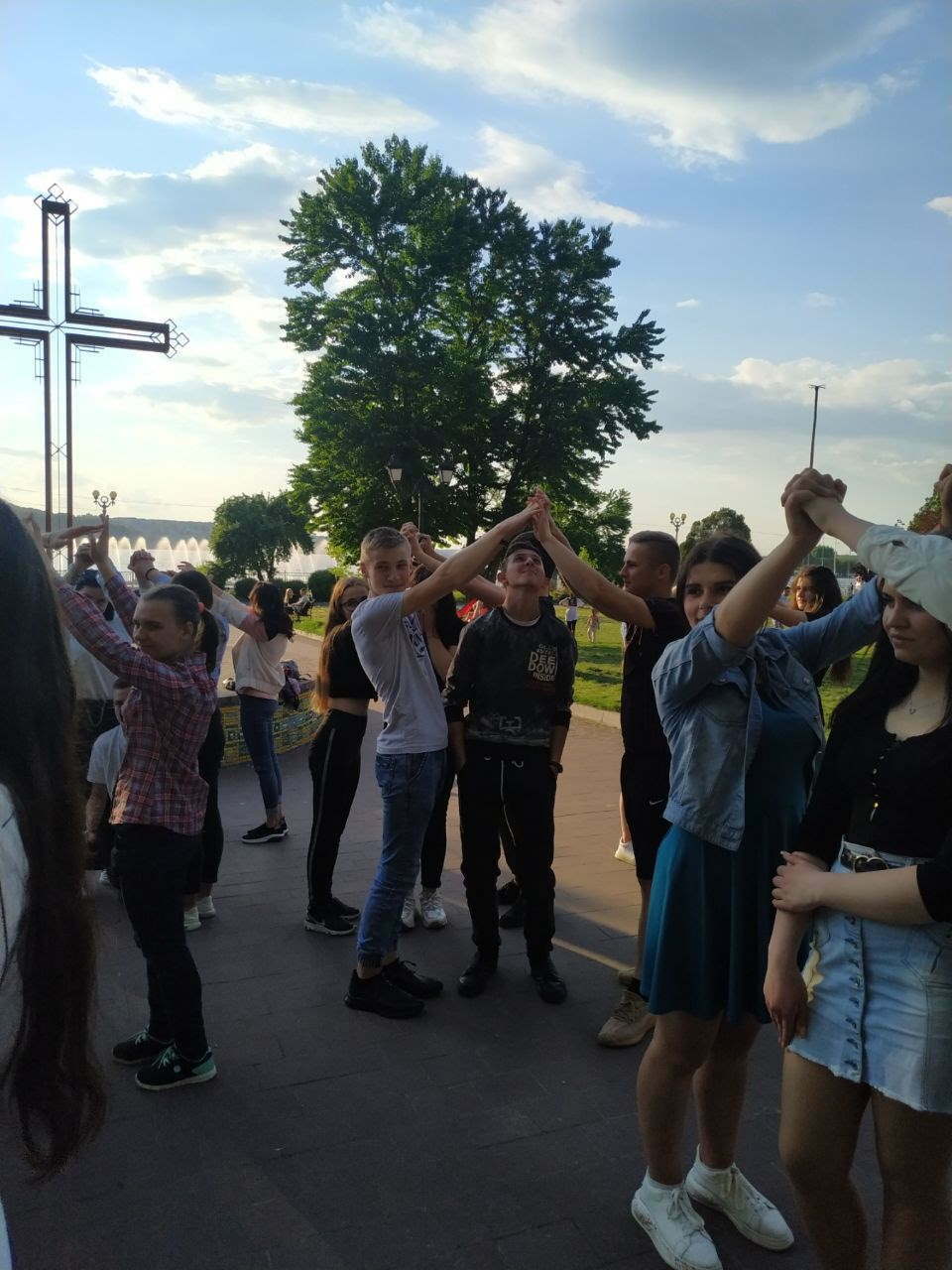 На набережній Тернопільського ставу гурт молоді зв’язував …сорочки, пояси, шнурки, футболки, хустинки, шарфи, кофтини в довжелезний канат…