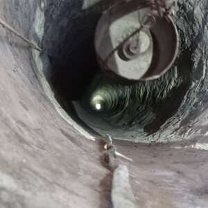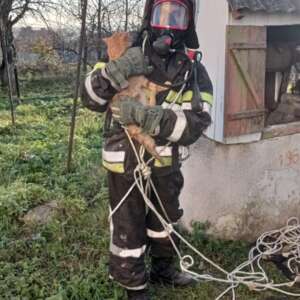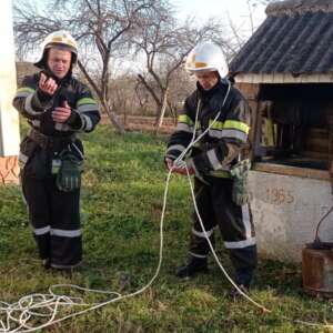 За допомогою рятувальних мотузок, в апаратах захисту органів дихання – бійці ДСНС спустились у колодязь глибиною 28 метрів та витягнули «потерпілого пухнастика».