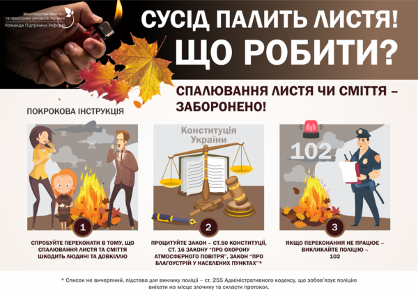 Осінь… І повітря вечорами наповнюється гірким димом від спаленого листя і бадилля. Закон, який передбачає штрафи за спалювання листя, напевно, неефективний. Для людей розробили спеціальні плакати, які рекомендують розміщувати всюди, де тільки можна. Однією з рекомендацій є варіант робити з листя компост-добриво.
