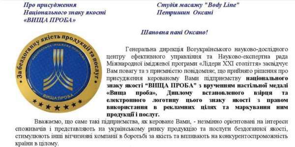 Всеукраїнський науковий дослідний центр ефективного керування та Науково-експертна рада Міжнародної імідживої програми “Лідери ХХІ століття повідомила, що студії масажу “Body Line” присуджено національний знак якості “Вища проба” з врученням настільної медалі “Вища проба”, диплому та електронного логотипу цього знаку якості: “Вважаємо, що саме такі підприємства, як студія масажу “Body Line” незмінно орієнтовані на інтереси споживачів і представляють на українському ринку послуги бездоганної якості, стимулюють інші вітчизняні компанії в боротьбі за якість та впливають на конкурентноспроможність країни в цілому”, зазначила у листі представниця конкурсу голова координаційної ради, директор ВНДЦЕУ В. Вознюк.
