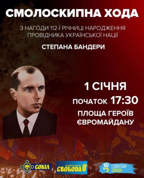 А вже о 17.30 біля пам’ятника Героям Небесної Сотні розпочнеться смалоскипна хода, приурочена 112-й річниці ідеологу й теоретику українського націоналістичного руху Степану Бандері.