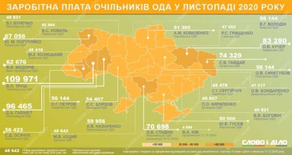 Зарплата Сергія Гайдая з Луганської обладміністрації склала 74 тис. 329 грн. Колишній керівник Миколаївської області Олександр Стаднік заробив за половину листопада 70 тис. 698 грн. Його наступник Віталій Кім уже отримав 4 тис. 650 грн зарплати за листопад.