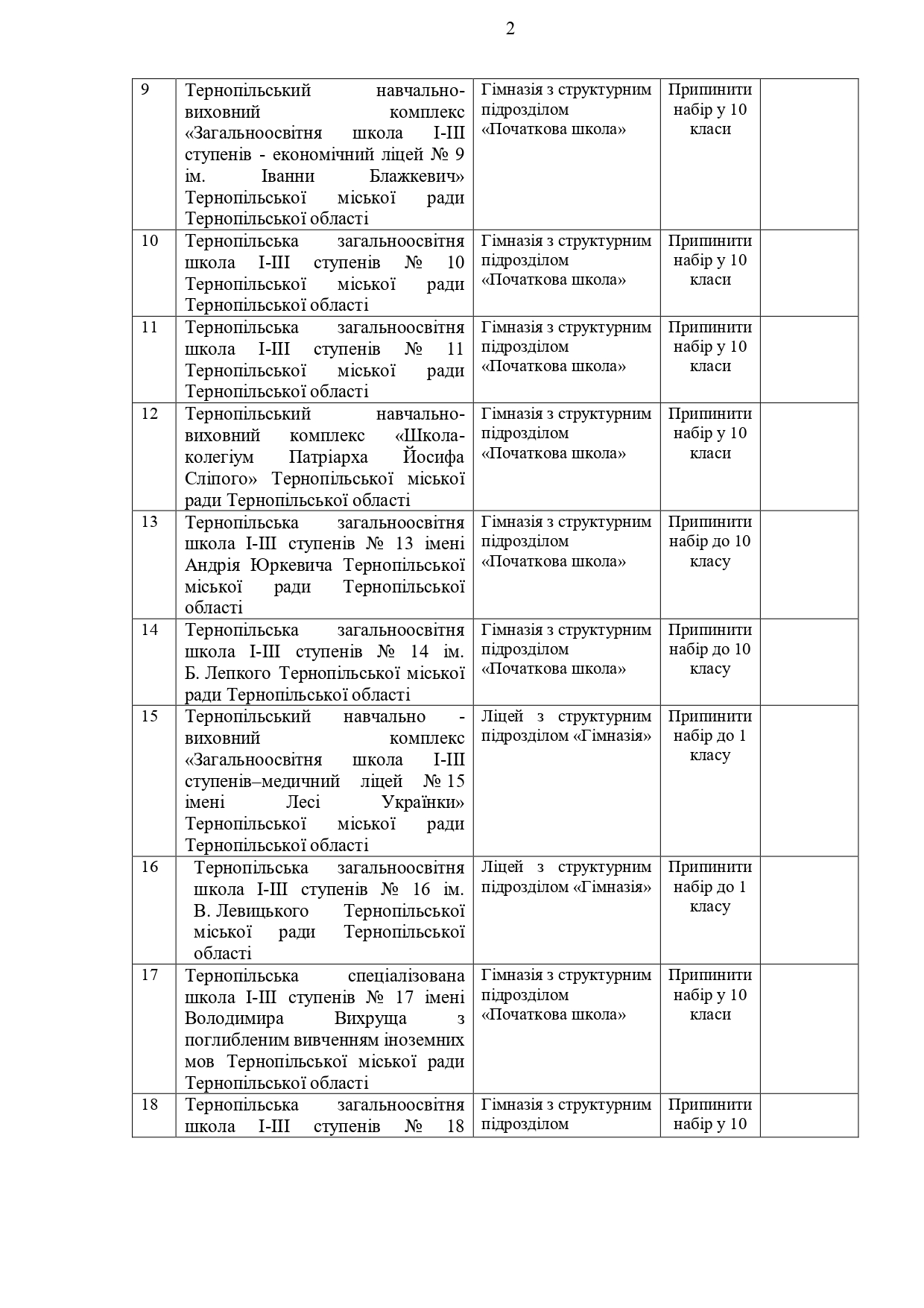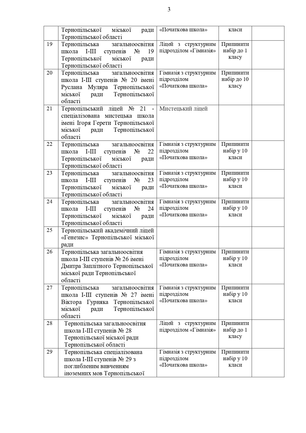 Якщо сеія затвердить план, то більшість шкіл Тернопільської громади, які нині навчають дітей з 1 по 11 клас, змінять формат роботи. Вони поступово стануть гімназіями з початковою школою, або ліцеями зі структурним підрозділом гімназії, але без набору першокласників. Тож, уже з цьогоріч  в одній частині тернопільских ЗОШ припиняють набір у 10 класи, а в іншій – не набиратимуть першачків.