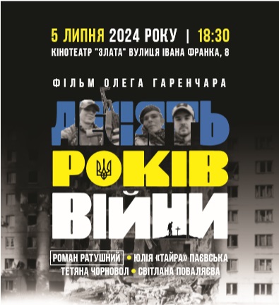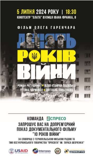 Допрем’єрний показ документального фільму «10 років війни» за участі творчої команди відбудеться у Тернополі в п’ятницю, 5 червня, о 18:30 в кінотеатрі «Злата», що на вул. Івана Франка, 8.