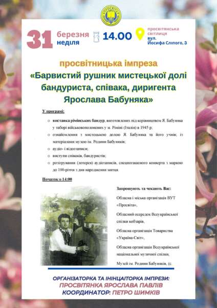 У рамках відзначення 100-ліття від дня народження Ярославв Бабунякв, у неділю, 31 березня, о 14.00 в світлиці, що на вул. Йосифа Сліпого, 3, відбудеться просвітницька імпреза «Барвистий рушник мистецької долі бандуриста, співака, диригента Ярослава Бабуняка».
