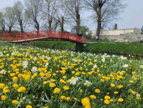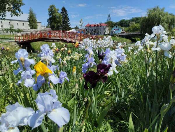 Буяють нарциси у Збаражі до середини травня, відтак передають естафету ірисам. Вони квітнуть поруч, через декоративний місток, під якими в’ється стежка, що символічно ділить берег річки на два окрайці.