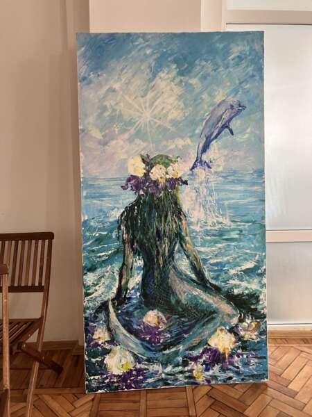 У рамках імпрези художниця оголосила онлайн-аукціон. На нього виставила величезну картину «Дельфін і Русалка». Писала її до 50-ліття Ігоря Хороша. Спільно вони вирішили продати полотно, а виручені кошти віддати на потреби військових. Стартова ціна – 33 тисячі гривень. З війною, оповідає просвітянка, картина набула нового значення. Русалка спостерігає за тим, як на дно йде останній російський корабель, а дельфін активно допомагає топити його.
